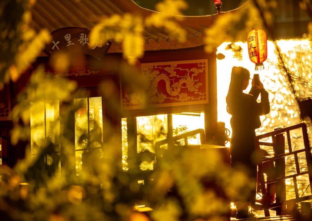 待到暮色四合,红灯笼次第亮起时,灯光透过菊瓣洒下斑驳的影,古建的飞檐若隐若现,恍若穿越千年的梦境。此时若乘上摇橹船夜游运河,看两岸的菊花在灯影里摇曳,听船桨划水的声响与远处的古筝声交织,便会懂为何古人说“秋菊有佳色,裛露掇其英”,这份在古城里独有的 “菊夜风情”,是国庆最值得珍藏的浪漫。