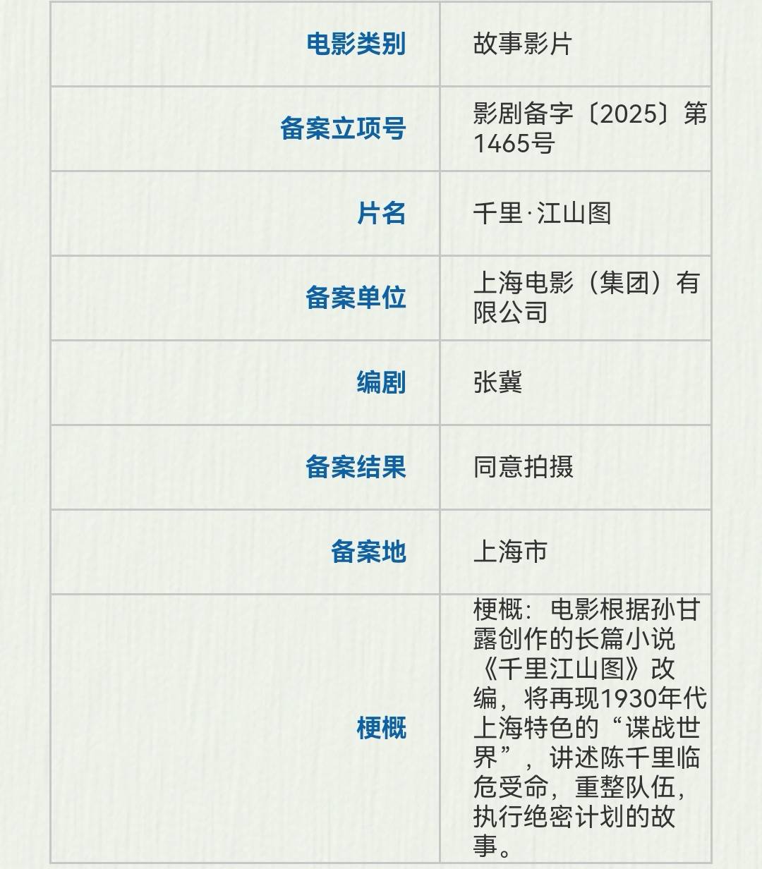 上海电影备案了张冀编剧的谍战片《千里·江山图》,电影根据孙甘露创作的长篇小说《千里江山图》改编,将再现1930年代上海特色的“谍战世界”,讲述陈千里临危受命,重整队伍,执行绝密计划的故事。