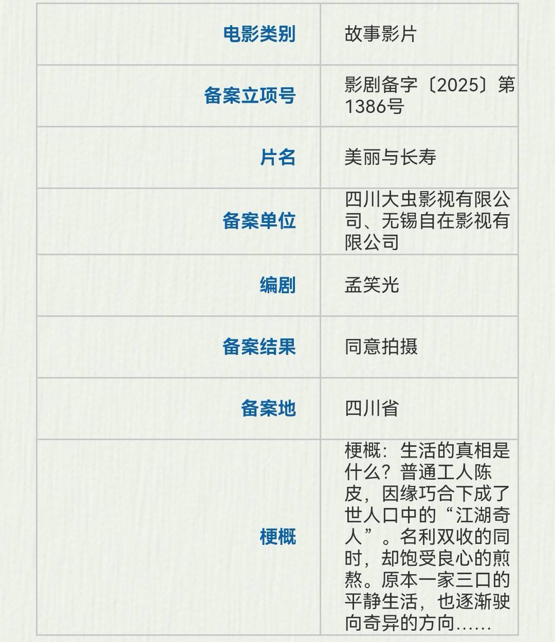 周韵、姜文的公司四川大虫影视和无锡自在影视备案了孟笑光编剧的《美丽与长寿》,故事讲的是普通工人陈皮,因缘巧合下成了世人口中的“江湖奇人”。名利双收的同时,却饱受良心的煎熬。原本一家三口的平静生活,也逐渐驶向奇异的方向。