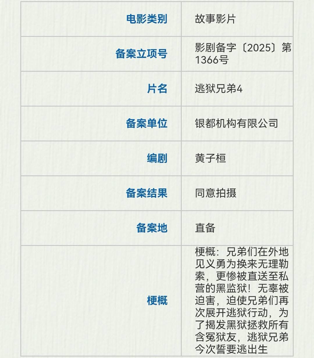 银都机构备案了黄子桓编剧的《逃狱兄弟4》,故事讲的是兄弟们在外地见义勇为换来无理勒索,更惨被直送至私营的黑监狱!无辜被迫害,迫使兄弟们再次展开逃狱行动,为了揭发黑狱拯救所有含冤狱友,逃狱兄弟今次誓要逃出生天。