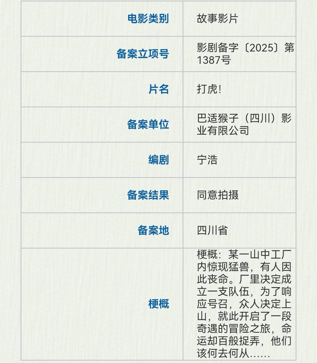 巴适猴子(四川)影业备案了宁浩编剧的《打虎!》,故事讲的是某一山中工厂内惊现猛兽,有人因此丧命。厂里决定成立一支队伍,为了响应号召,众人决定上山,就此开启了一段奇遇的冒险之旅,命运却百般捉弄,他们该何去何从。