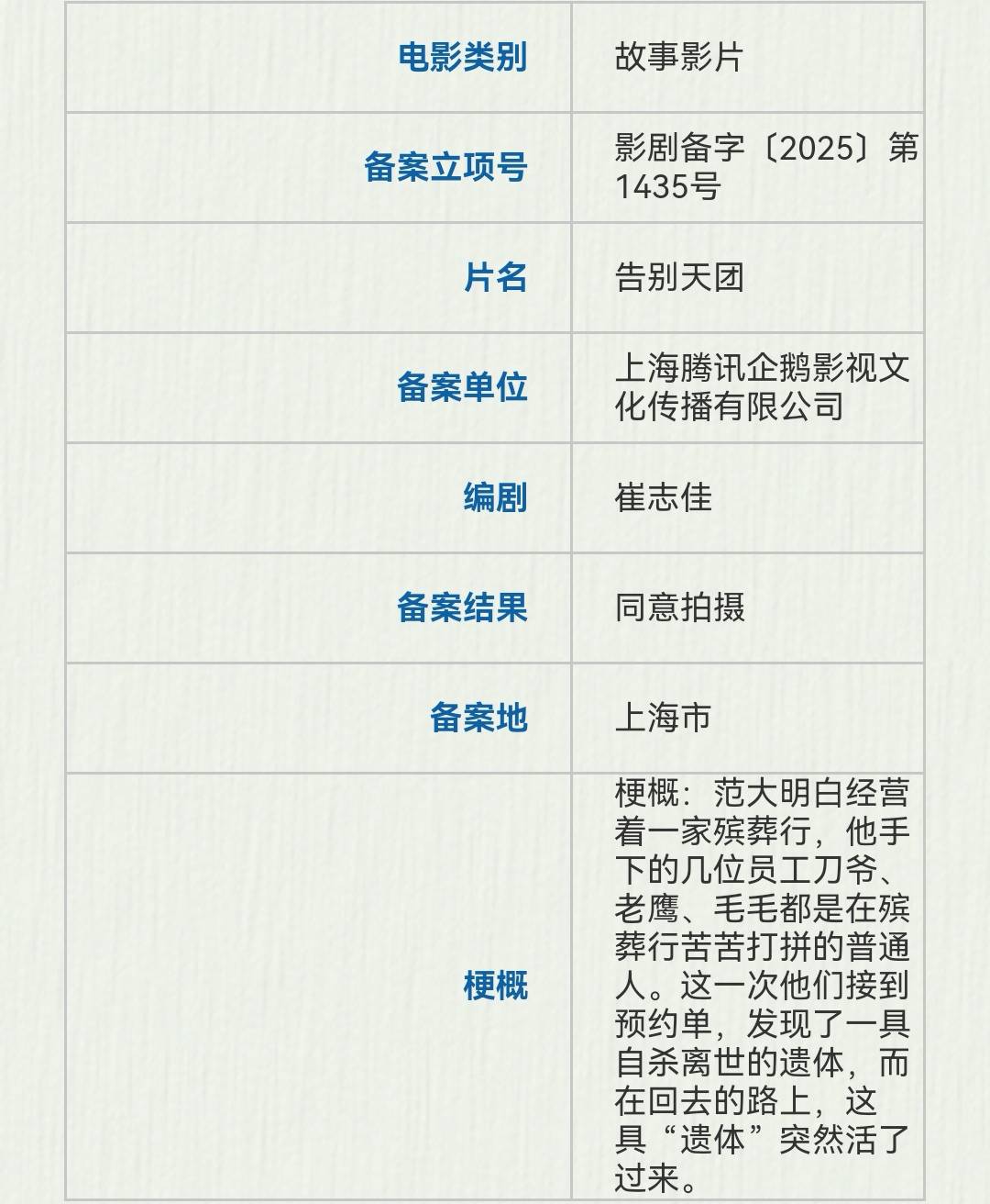 上海腾讯企鹅影视文化传播备案了崔志佳编剧的《告别天团》,故事讲的是范大明白经营着一家殡葬行,他手下的几位员工刀爷、老鹰、毛毛都是在殡葬行苦苦打拼的普通人。这一次他们接到预约单,发现了一具自杀离世的遗体,而在回去的路上,这具“遗体”突然活了过来。