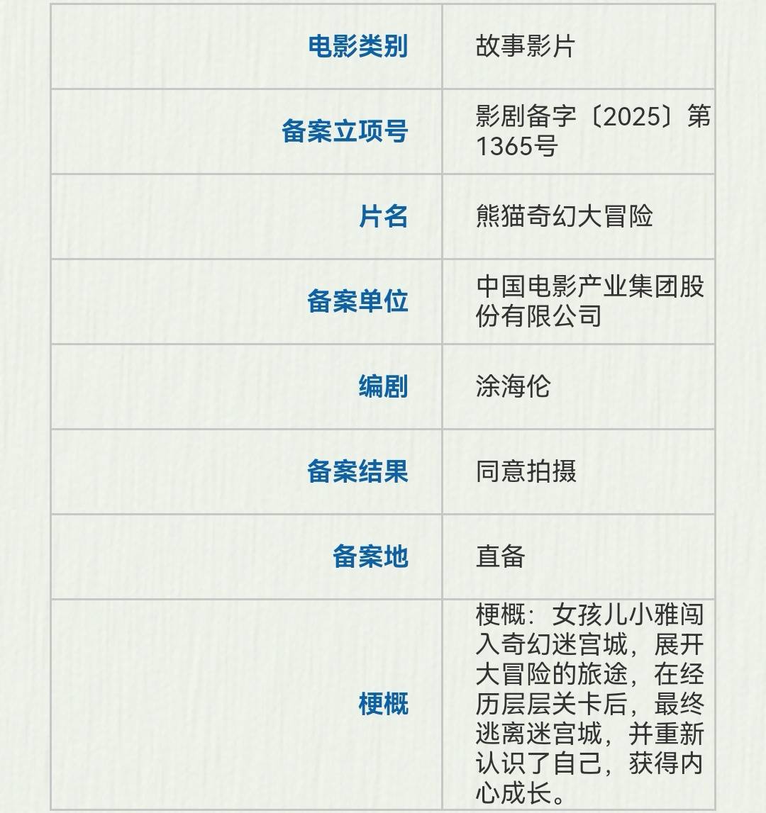 中国电影产业集团备案了涂海伦编剧的《熊猫奇幻大冒险》,故事讲的是女孩儿小雅闯入奇幻迷宫城,展开大冒险的旅途,在经历层层关卡后,最终逃离迷宫城,并重新认识了自己,获得内心成长。